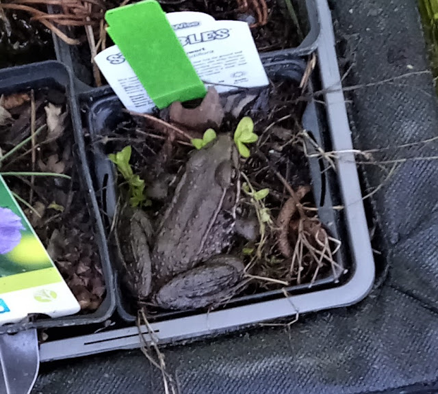 During a visit to the nursery for garden plants, we found this little frog in one of the pots.  Was he for sale?